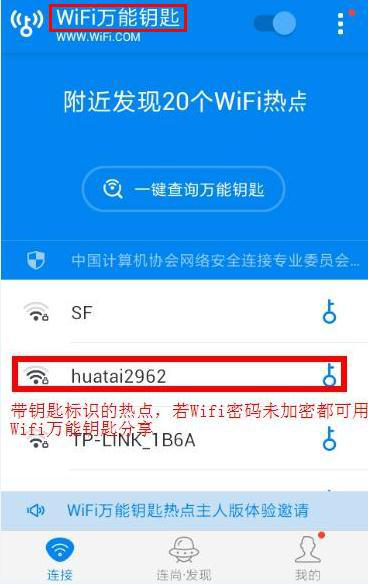 圖 1:手機安裝WIFI萬能鑰匙,搜索到帶鑰匙標的熱點,若WIFI密碼未加密的情況下可被萬 能鑰匙分享