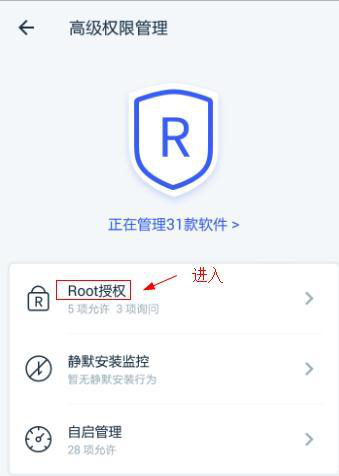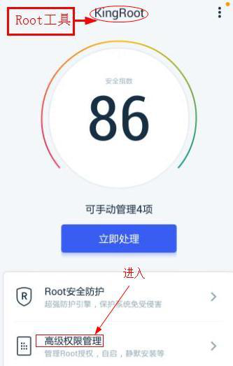 圖 3 :使用手機安裝的Root工具 ,如King Root(360超級Root亦可)進入高級權(quán)限管 理