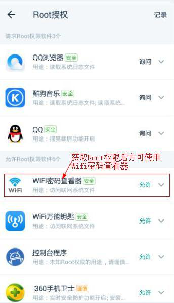 圖 5 :獲取ROOt權(quán)限后方可在手機上安裝和使用Wifi密碼查看器,設(shè)置允許便可